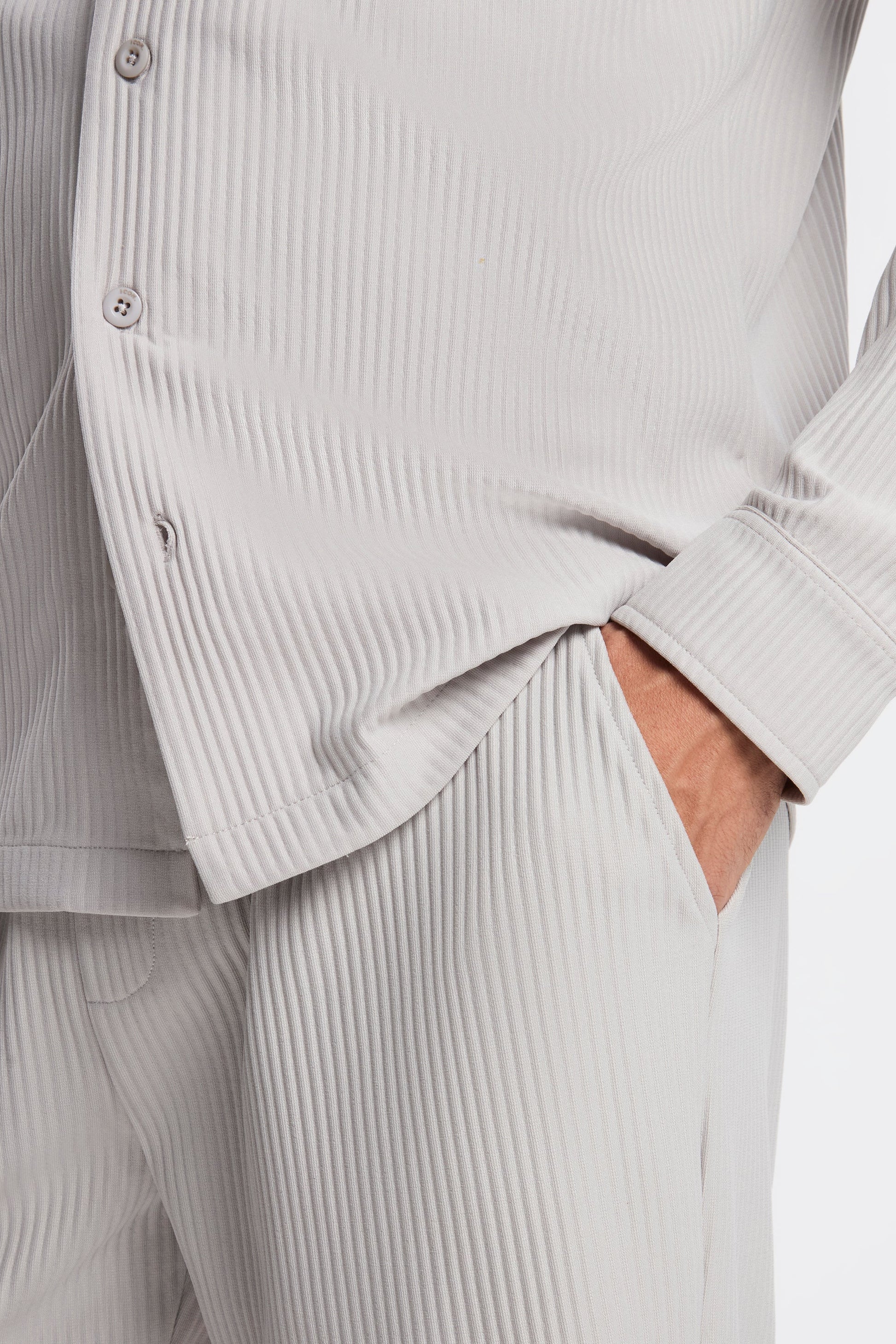 A long sleeve shirt crafted from fine pleated fabric, offering texture with a lightweight feel. Designed with a revere collar, straight hem and finished with an branded button closure for a subtle signature detail.